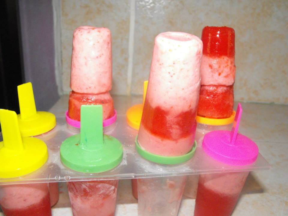 4. Add the alternate mixture to the one you already have in the mold 1/3 of the way ( i.e if you had put the yogurt mixture at the bottom, now put the strawberry one and vice versa) and freeze for another 45 minutes or so.