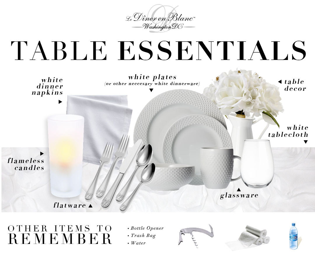 The organizers are going to provide tables, chairs and table clothes. You will have to set up the table yourself and then decorate it. Remember that the theme is white though gold, silvers or generally metalic items are allowed . So what to carry: